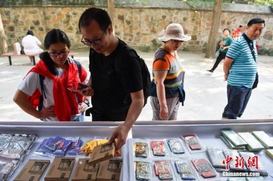 10月3日,圓明園遺址公園首次開啟文創(chuàng)大集,20余個(gè)系列的800多件文創(chuàng)產(chǎn)品悉數(shù)亮相。圖為游客在挑選圓明園文創(chuàng)產(chǎn)品。中新社記者 崔楠 攝