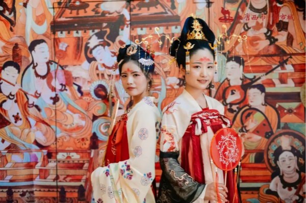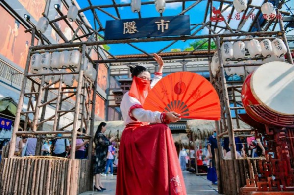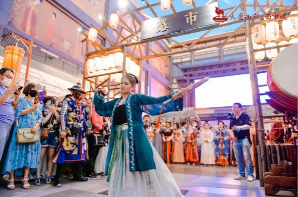 折纖腰以微步,呈皓腕于輕紗,眸含春水清波流盼,髻斜插碧玉龍鳳釵。唐風(fēng)巡游走過西市的每個角落。潮流機(jī)車&古典美女,碰撞出別樣的火花,開市鼓激昂、胡旋舞妖嬈,繁華熱鬧的“隱市”里,這邊風(fēng)景獨(dú)好!胡姬酒肆玩擊鼓傳花,賞清平調(diào)、看參軍戲。