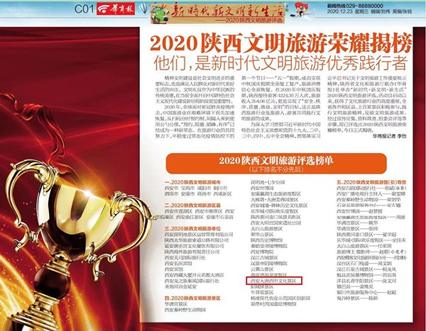 陜西省文化和旅游廳主辦、《華商報》承辦的“新時代·新文明·新生活”2020年陜西文明旅游征集及評選活動,12月23日榮耀揭榜,大唐西市文化景區(qū)榮獲2020陜西文明旅游景區(qū)。