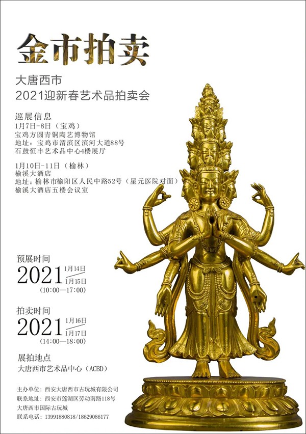 2021年1月16至17日將在大唐西市藝術(shù)品中心舉槌開拍,1月14日至15日進(jìn)行預(yù)展。金市拍賣—大唐西市藝術(shù)品拍賣會,自創(chuàng)辦以來,立足西北,面向全國,堅持真實誠信、客戶至上的原則,為廣大藏友提供最專業(yè)的拍賣服務(wù),持續(xù)推出高質(zhì)量的拍賣盛會。