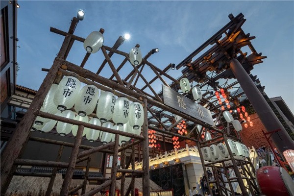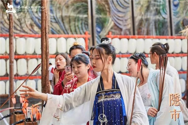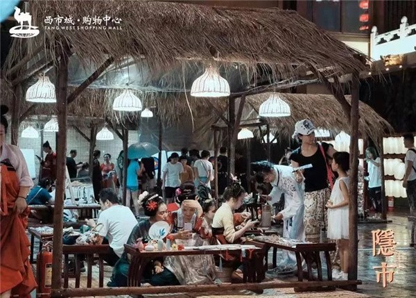 往進走,映入我們眼簾的是用木頭搭建掛滿一個個紅色燈籠的門頭,黑色的門匾上雕刻著“隱市”兩個字,走進門,只見一間間排列整齊的茅草屋,茅草屋下出售形態(tài)各異的大唐面具,香氣四溢的香囊,五顏六色的折扇,精致小巧的手工小飾品,還有很多雍容華貴、色彩斑斕的唐裝,充滿了大唐的氣息,運氣好的話,你還能碰上一場精彩的唐朝服飾演出。