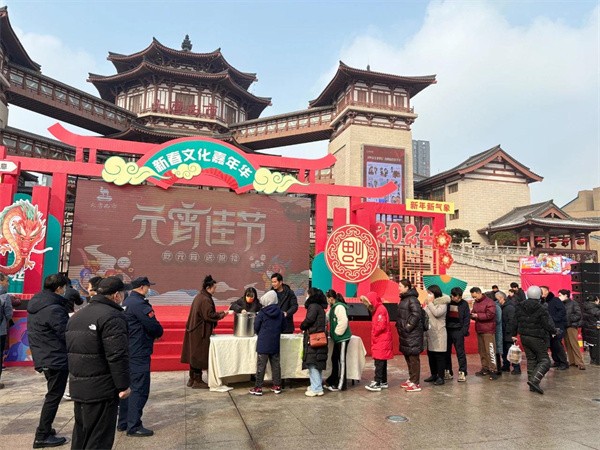 在金市廣場上,元宵在煮沸的大鍋里翻滾,近千位環(huán)衛(wèi)工人、安保人員以及游客們依次排隊(duì)領(lǐng)到了熱氣騰騰的元宵。在持續(xù)三小時(shí)的活動(dòng)中,大家猜燈謎、逛西市不亦樂乎,大唐西市準(zhǔn)備了豐富多彩的文化活動(dòng)。隱市大集里的魚燈巡游、漢服游園會(huì)讓人目不暇接,在藝術(shù)中心,“彩繪絲路——中國當(dāng)代著名美術(shù)家絲綢之路萬里行大型文化交流活動(dòng)”書畫精品展也吸引了游客們的關(guān)注。