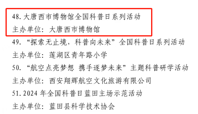 據(jù)了解,為肯定成績,樹立典范,充分調(diào)動全市社會力量積極投身公民進科普工作向更高更深層次發(fā)展,依據(jù)有關(guān)通知要求,在各單位申報、區(qū)縣科協(xié)推薦基礎(chǔ)上,對申請評優(yōu)對象進行了評選,對70個單位和陜西省暨西安市2024年全國科普日主場活動等55項線上線下科普活動進行表揚,大唐西市博物館榮列其中。