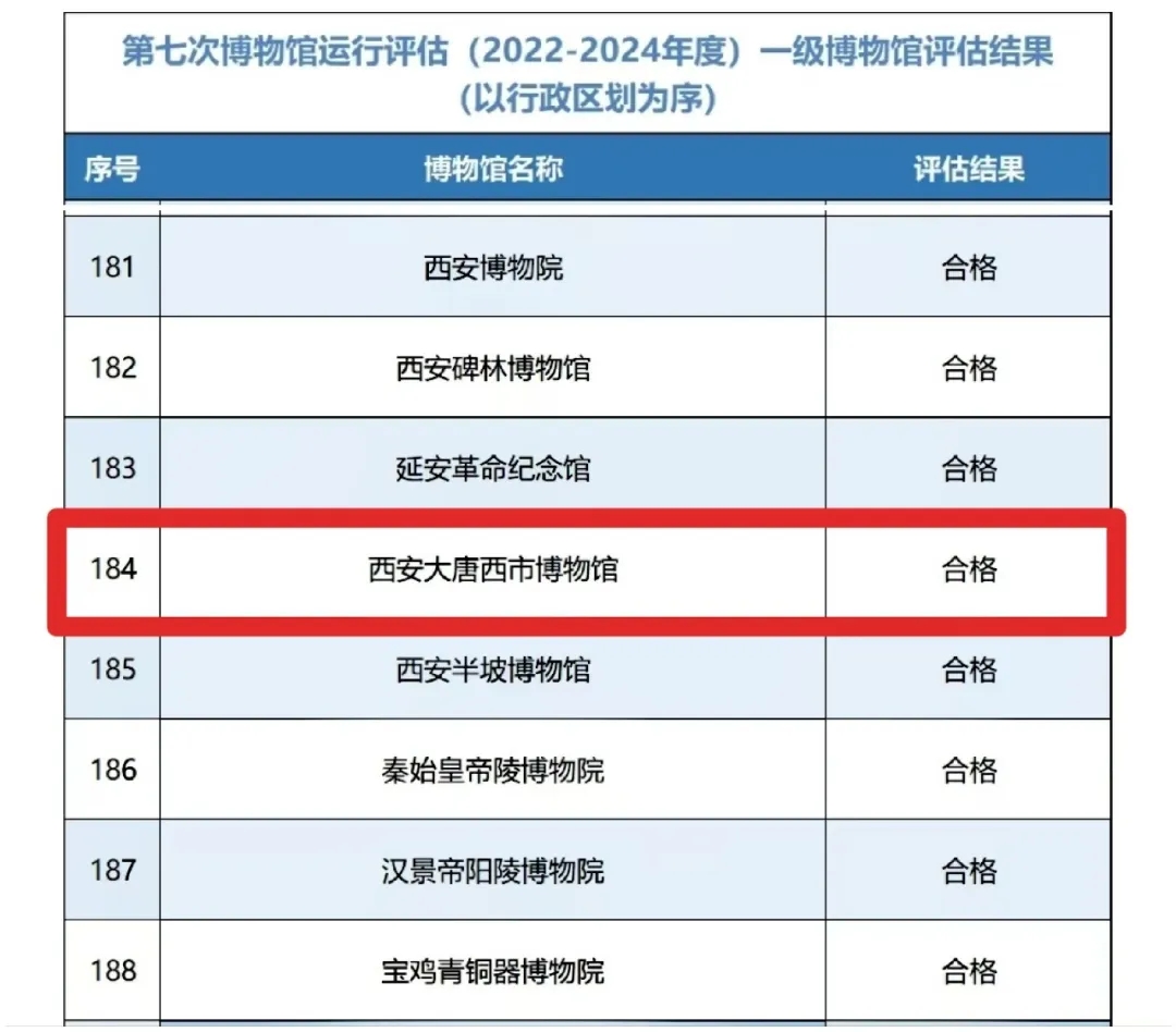 據(jù)國(guó)家文物局發(fā)布的《博物館運(yùn)行評(píng)估辦法》,5月18日,中國(guó)博物館協(xié)會(huì)正式公布了第七次博物館運(yùn)行評(píng)估結(jié)果(2022-2024年度),西安大唐西市博物館通過(guò)國(guó)家一級(jí)博物館運(yùn)行評(píng)估。