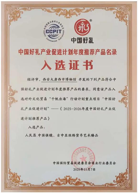 近日,從中國(guó)好禮產(chǎn)業(yè)促進(jìn)計(jì)劃2025--2026年度推薦產(chǎn)品終評(píng)會(huì)上再傳喜訊,大唐西市博物館開發(fā)的“人民昌·中國(guó)強(qiáng)鏡”與“古中亞絲路貨幣藝術(shù)臻品” 兩項(xiàng)文化創(chuàng)意產(chǎn)品,憑借其深厚的歷史底蘊(yùn)與創(chuàng)新的設(shè)計(jì)理念,在全國(guó)超5000款參賽產(chǎn)品中脫穎而出,成功入選“2025--2026年度中國(guó)好禮產(chǎn)業(yè)促進(jìn)計(jì)劃推薦產(chǎn)品 ”名單!兩款產(chǎn)品曾相繼入選“陜西好禮”年度推薦名錄,本次入選國(guó)家級(jí)獎(jiǎng)項(xiàng),不僅是對(duì)大唐西市博物館文創(chuàng)產(chǎn)品藝術(shù)價(jià)值與創(chuàng)新實(shí)力的高度認(rèn)可,更是對(duì)中華優(yōu)秀傳統(tǒng)文化創(chuàng)新轉(zhuǎn)化的有力肯定。